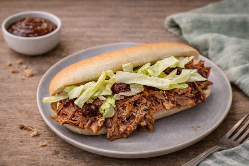 - Vul de broodjes met pulled pork en werk af met sla, rode ui en wat augurk.