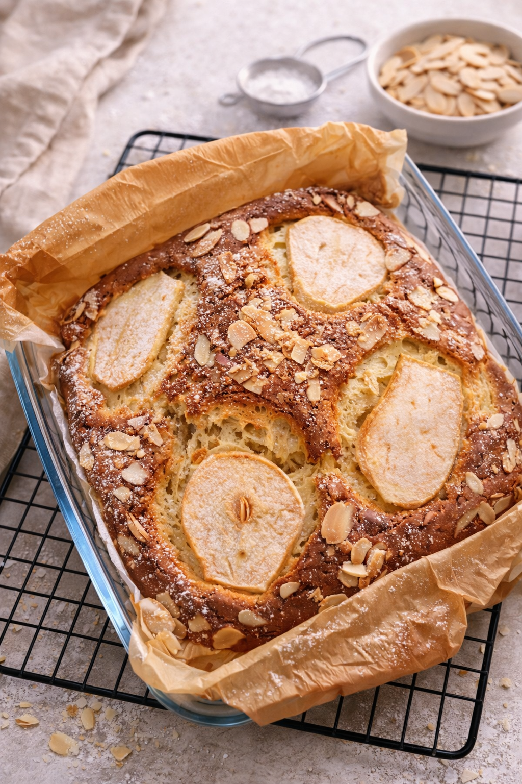- Bekleed een bakvorm met bakpapier en leg het vel bladerdeeg er in. Giet het beslag er op en strijk glad met een spatel. Leg de schijfjes peer bovenop het beslag.