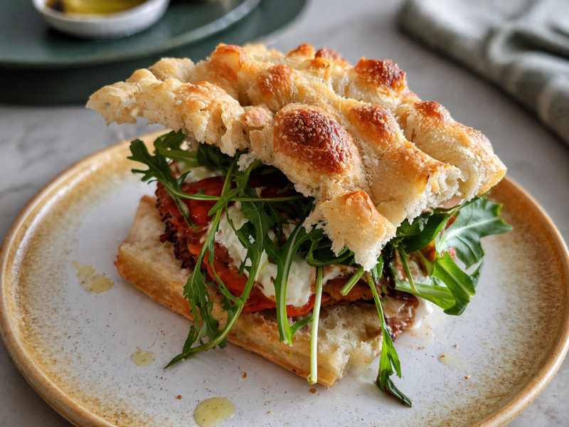 Gezellig afsluiten met een rijk belegde focaccia. Perfect voor een relaxte zondag met nét dat beetje extra. Ik gebruik hier mijn homemade zuurdesem focaccia die ik beleg met een laagje pesto, een Italiaanse schnitzel, burrata, zongedroogde tomaatjes en rucola.
